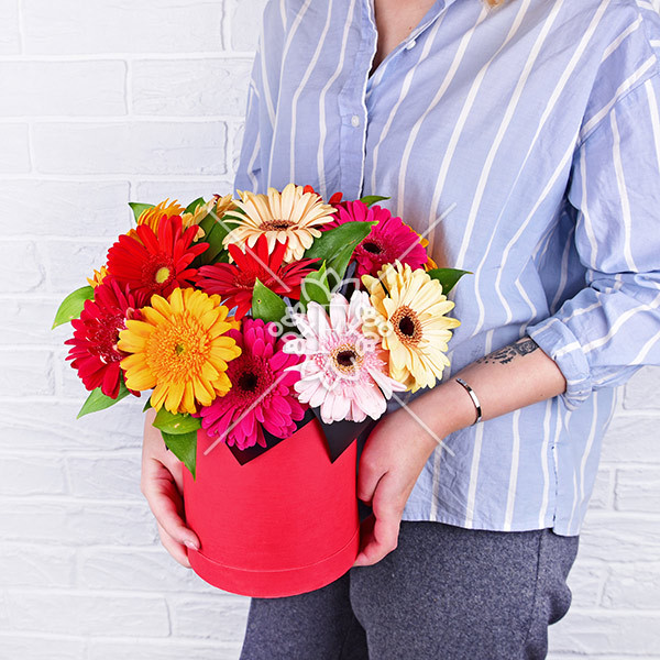 гербера разноцветная - 17 шт., зелень декоративная, оазис, коробка. Примерный размер: 25Х30 см.